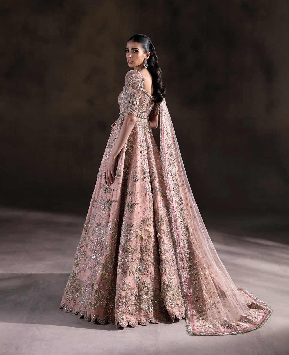 In peach organza, this gown combines classic charm with innovative detailing. The sweetheart neckline and puff sleeves with scalloped finishes exude romantic allure and vintage elegance. The scalloped hem features subtle ganga jamni handwork, while 3D flower details add an organic grace. The net dupatta completes the ensemble with sequined borders and intricate 3D floral motifs, showcasing meticulous craftsmanship.