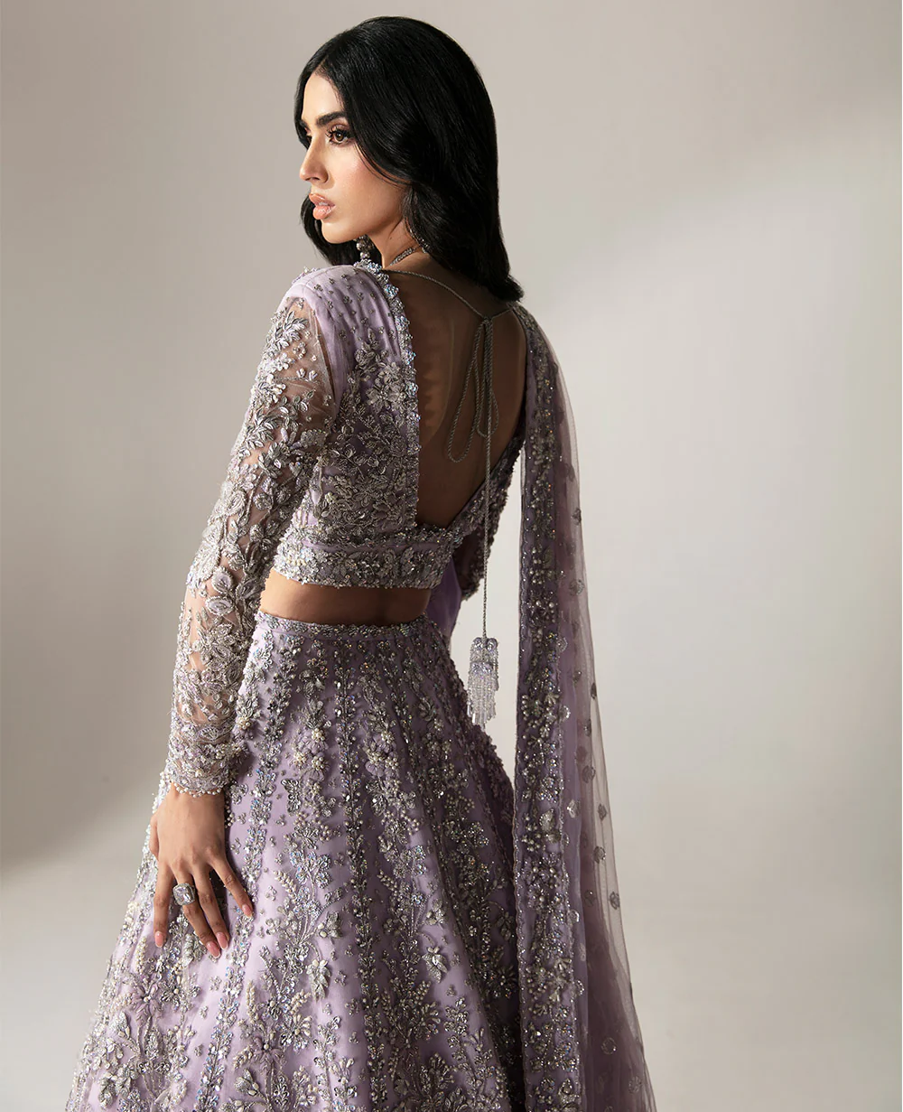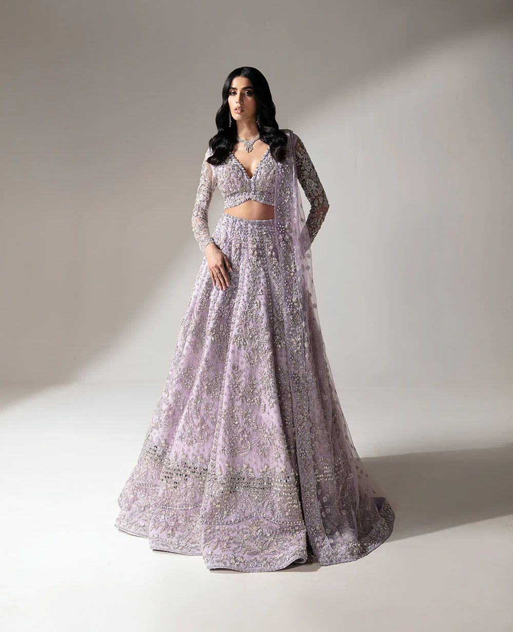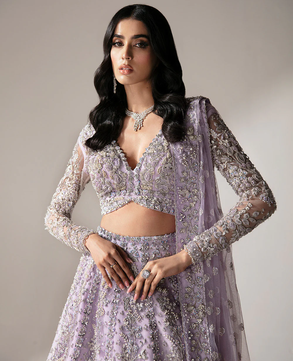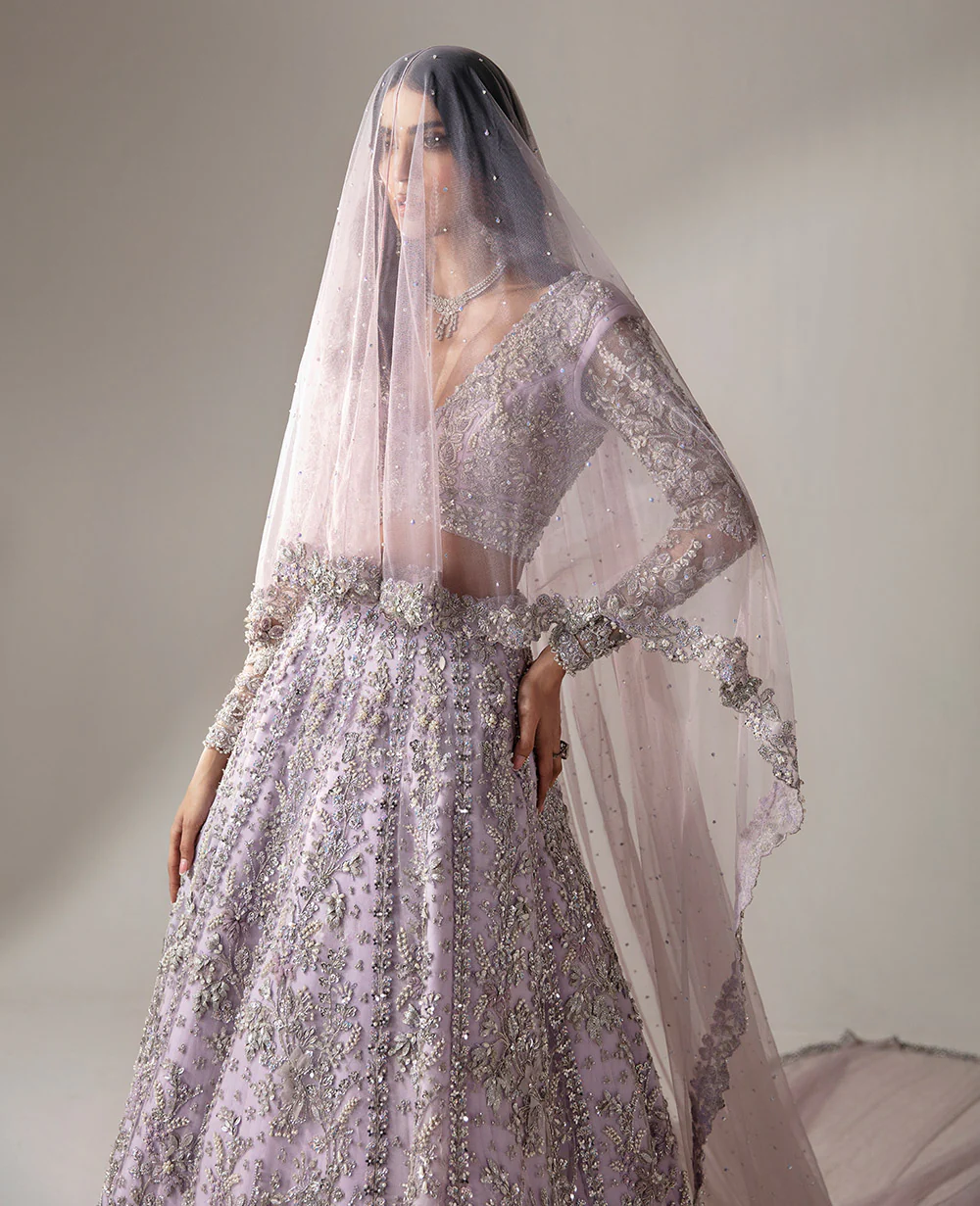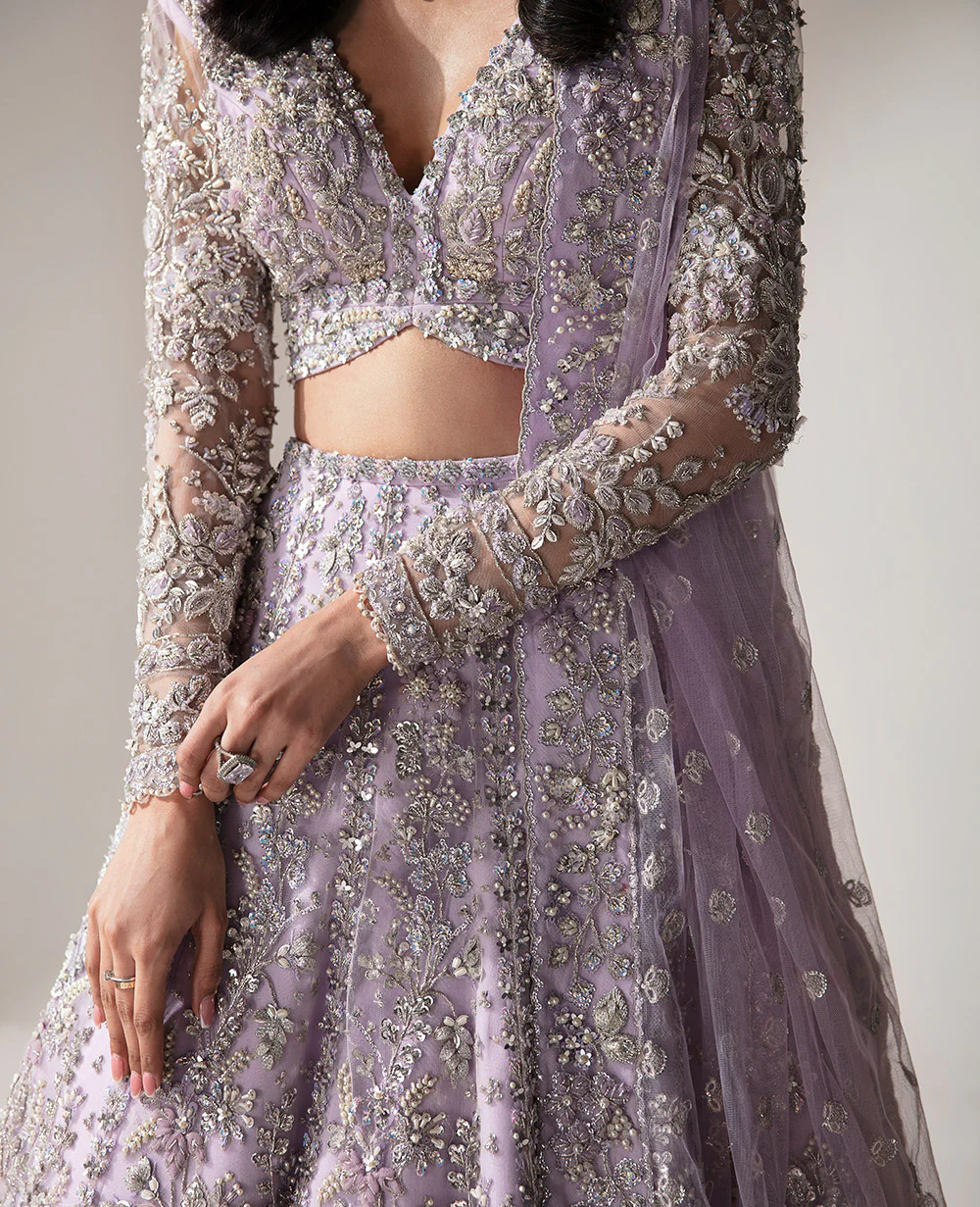 In soft lilac net, this lehenga-choli ensemble is a symphony of silver and light. The plunging V neckline choli features intricate silver work and floral compositions, showcasing meticulous handwork. The lehenga shines with mirror work, while the celestial veil is adorned with delicate sitara and pearl sprays. Organza 3D flowers and leaves add a touch of spring garden elegance under a moonlit sky. This gown epitomizes heritage craftsmanship and contemporary elegance, redefining bridal beauty in lilac.