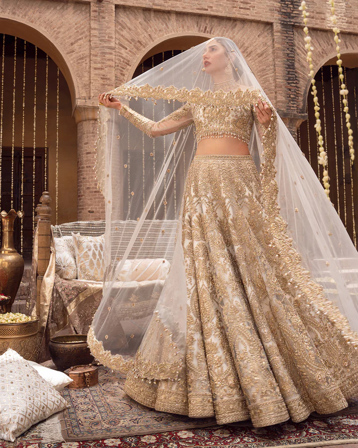 This exquisitely ornamented lehnga choli is the epitome of classic elegance.