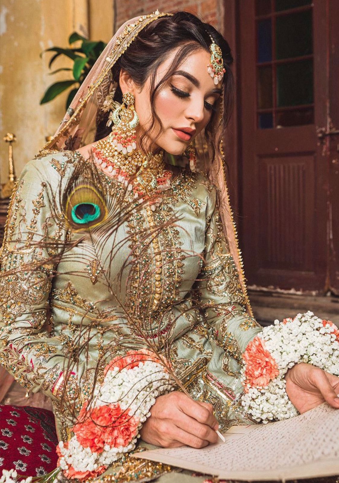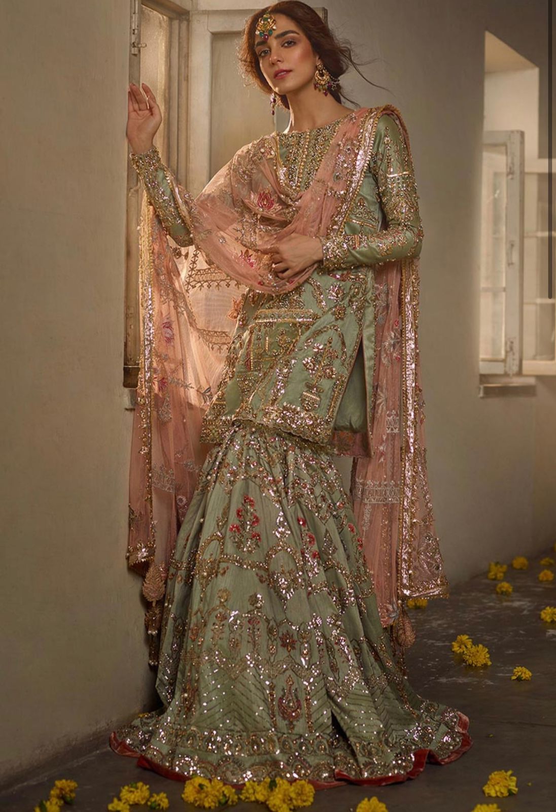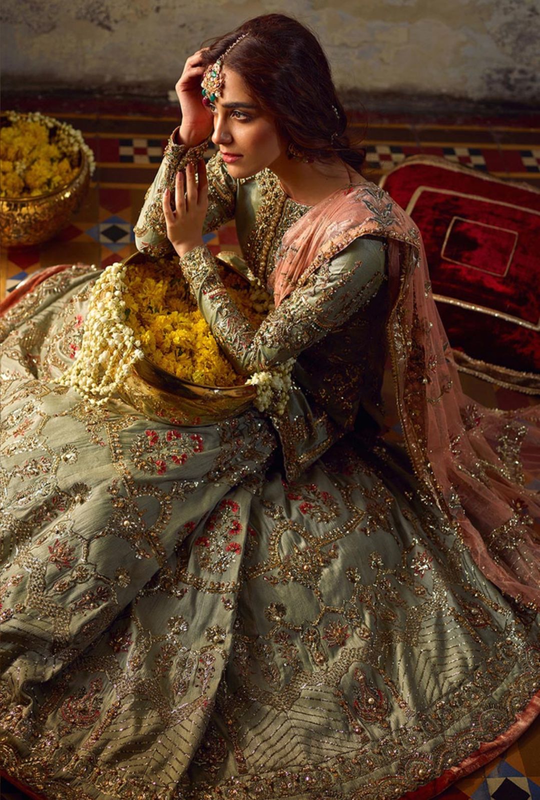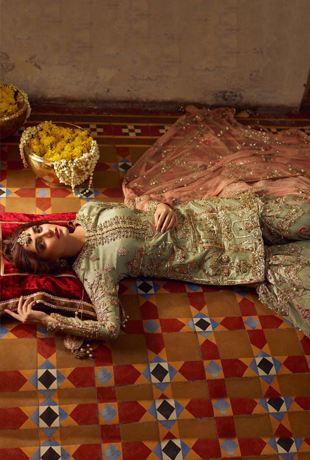 Rent It NowIs outfit mein soft sage green lehenga hai jo delicate gold, pink aur silver embroidery se finely embellished hai aur bohat elegant feel deta hai. Shirt aur lehenga par floral aur vine motifs ka kaam subtle luxury ko highlight karta hai. Saath sheer blush pink dupatta hai jo light sequins aur embroidered borders ke sath softly draped hai. Overall look graceful, timeless aur perfect hai for a classy bridal ya formal occasion.