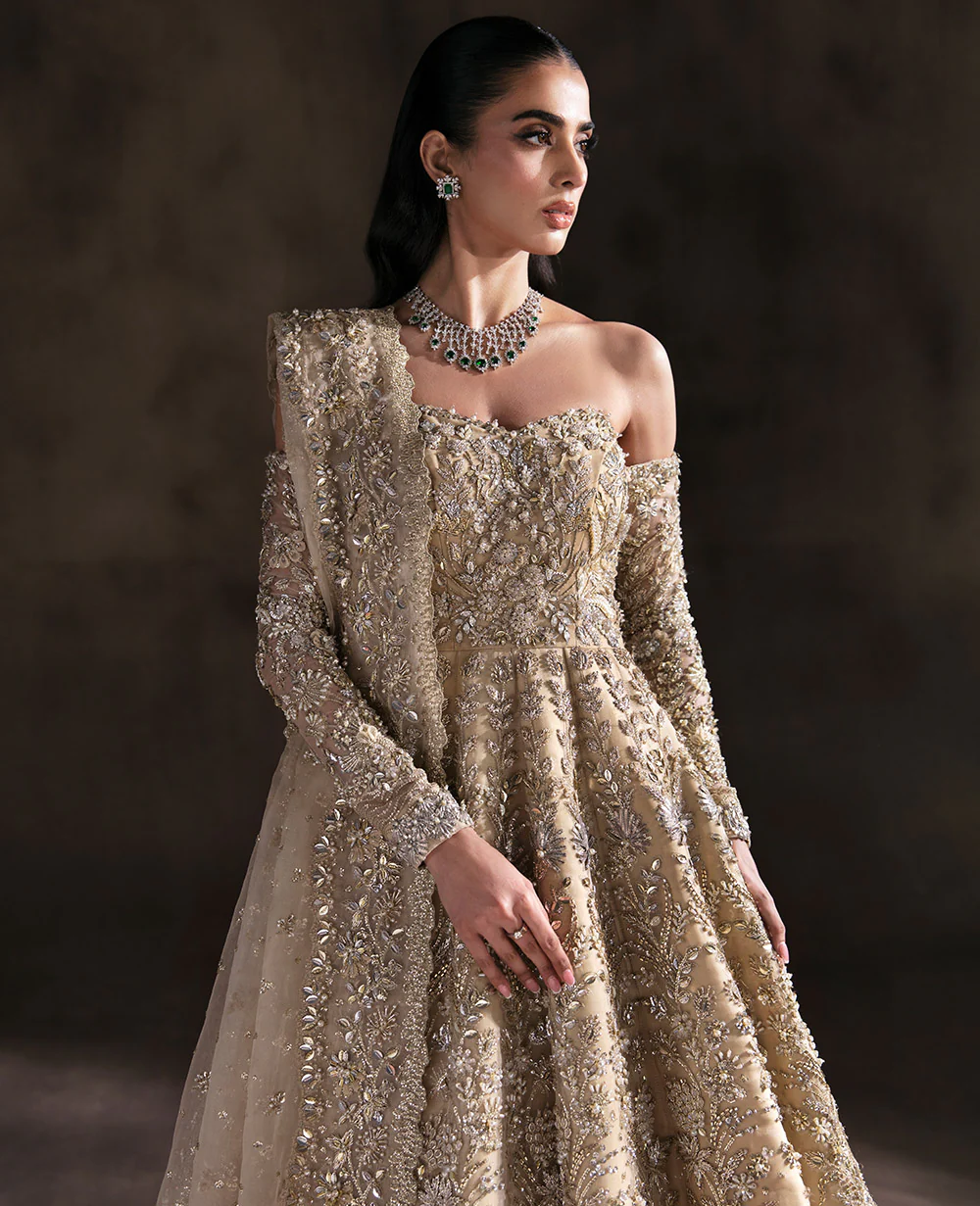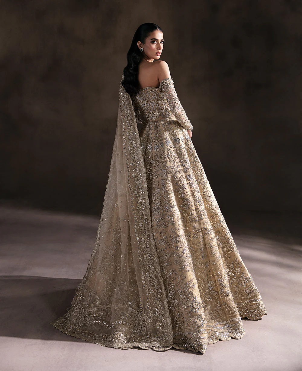 Crafted from champagne-hued organza and net, this gown celebrates the bride with sequins, crystals, and pearls adorning the off-shoulder bodice. The lehenga features intricate cut dana and raisham filigree work on its scalloped hem, complemented by 3D organza flowers. The organza dupatta, edged with scalloped borders, completes this bridal ensemble with elegance and fantasy.
